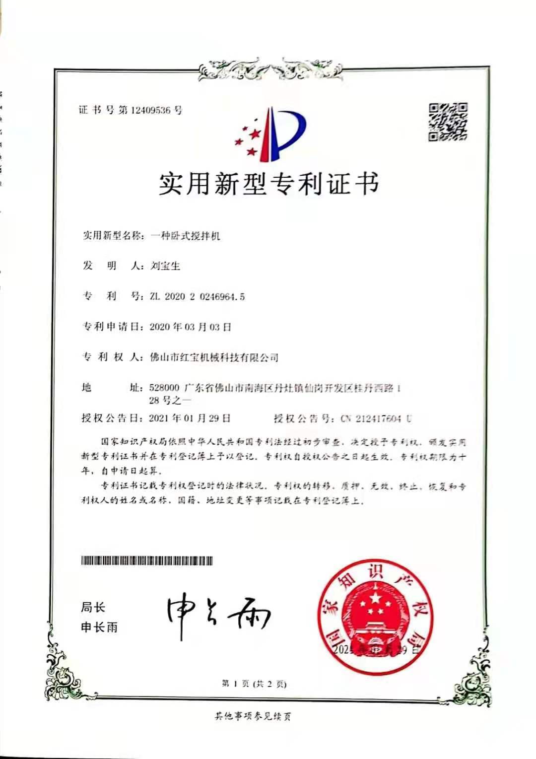 新款塑料攪拌機專利證書